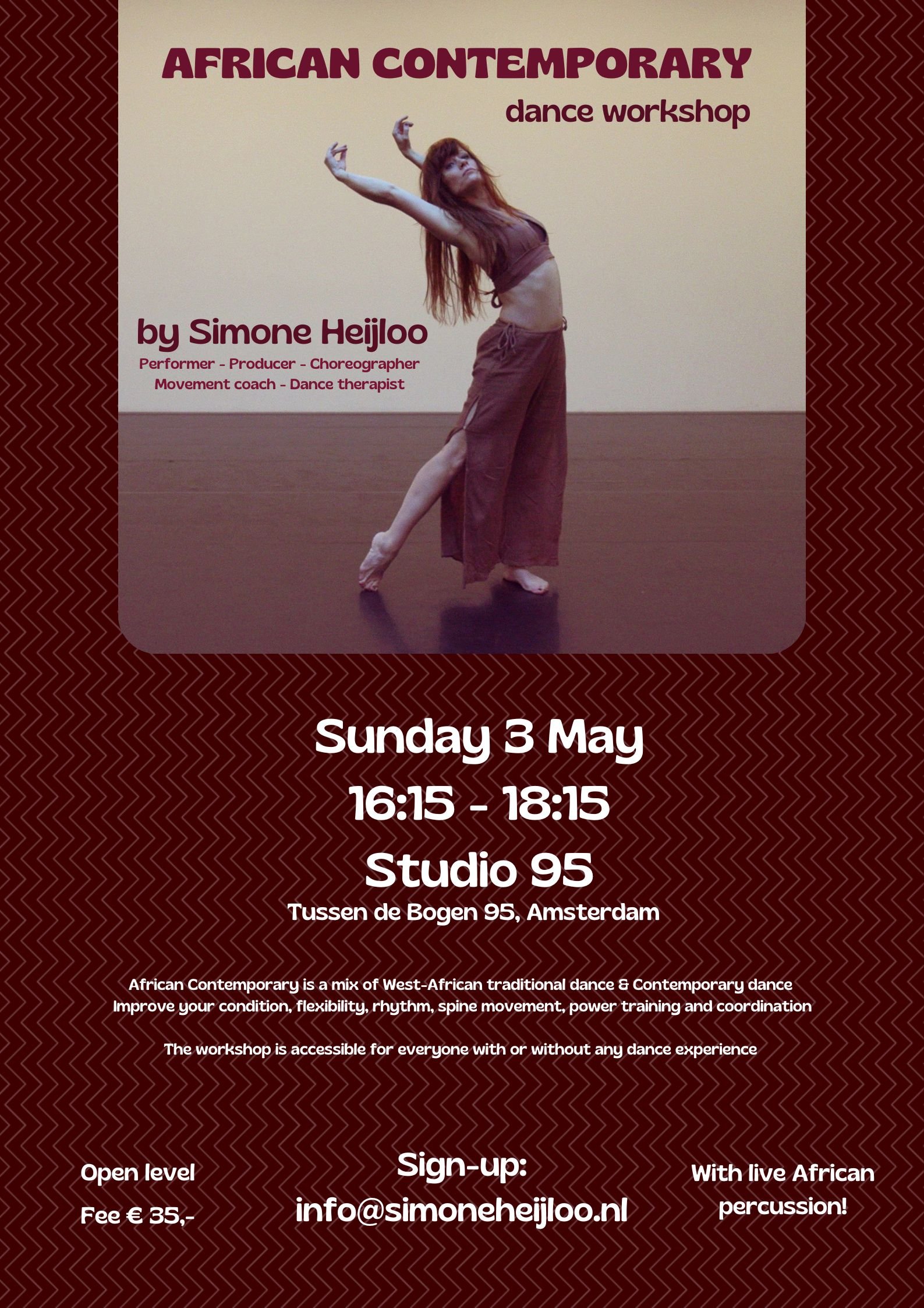 May 3, 2026 African Contemporary dance workshop with live African percussion! May 3, 2026 - to - May 3, 2026